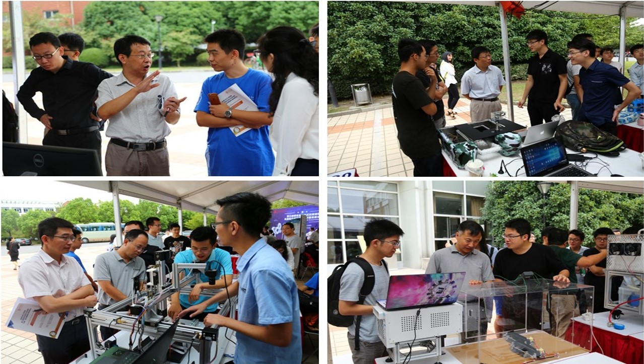 在课程项目展示环节, 7个教学班推出的34组项目团队在机械动力学院A楼广场进行项目展示。同学们通过展板和视频展示、实物演示和现场互动等环节,向评委及观众介绍了精心完成的作品,如:应用于电动汽车生产过程中动力电池总成装配环节的自动化线束插口对接设备、针对目前共享雨伞锁体结构简单回收雨伞困难而设计的基于物联网的雨伞共享平台、基于人手动作模式设计灵感的手指康复机器人、针对学校图书馆24小时还书机开发的智能图书整理小车、针对现有老人护理床功能和自动化程度缺陷问题而设计的多功能医护床、实现家居管理信息化的Insight家居智能互联系统、针对市面上导盲仪器价格昂贵而设计的智能导盲机器人等等。经过企业专家评委和校内专家评委的评选,智能图书整理小车等15组作品入围课程项目竞赛环节。
