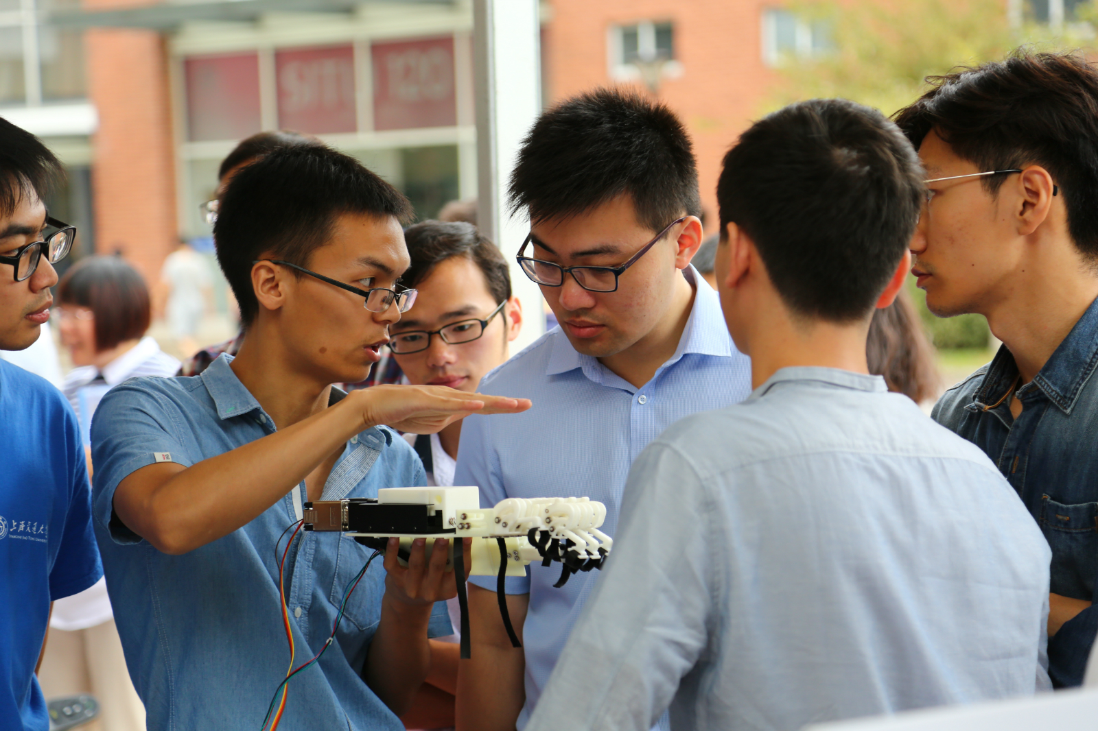 本次项目式实践课程竞赛,恰逢全国“大众创业、万众创新”双创活动周,课程竞赛中的部分获奖作品智能图书整理小车、手指康复机器人、智能导盲机器人、自跟随智能小车,应邀在2017年全国大众创业万众创新活动周“上海交大-闵行”专场活动中展示,365best官网专业学位研究生学子的创新实践设计理念及作品吸引了社会各界的广泛关注。