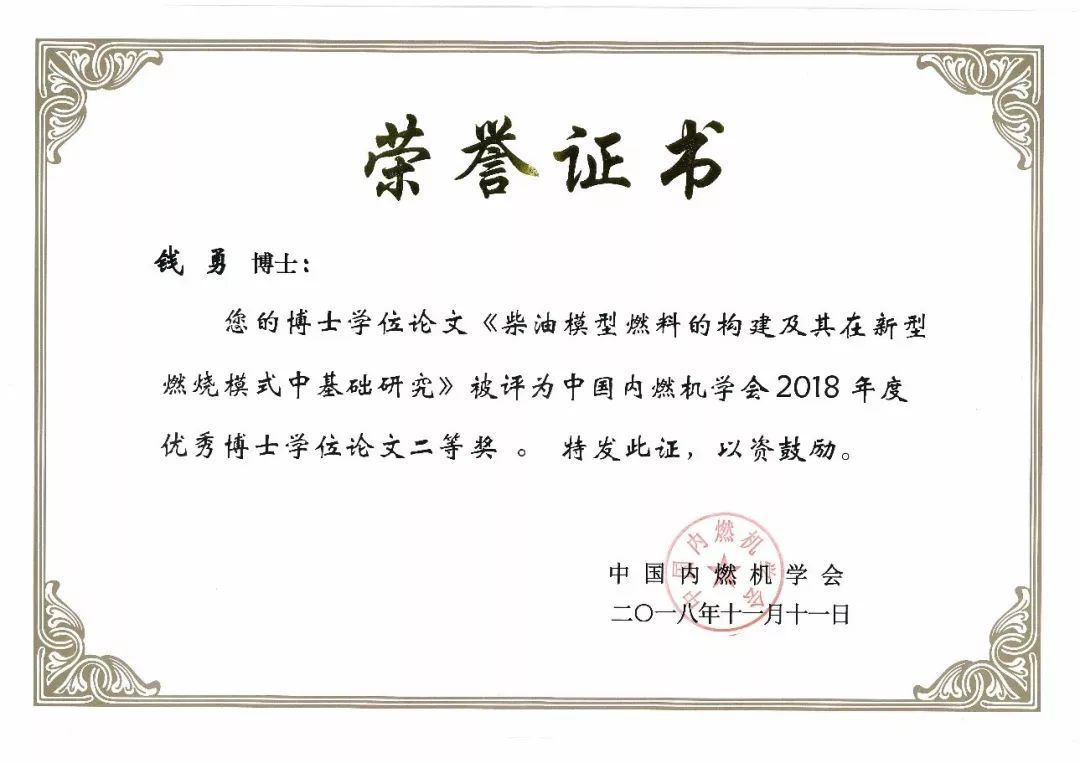 11月11日,中国内燃机学会2018年“优秀博士学位论文奖”颁奖典礼在无锡举行。365best体育亚洲官网吕兴才教授指导的博士生钱勇的学位论文《柴油模型燃料的构建及其在新型燃烧模式中的基础研究》获得二等奖。