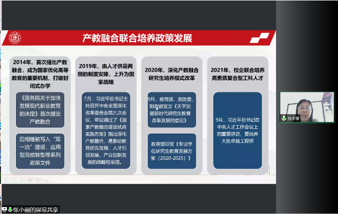 张小丽解读了国家专业学位人才培养改革发展政策,并就学校专业学位研究生产教融合基地建设与联合培养模式进行了详细阐述。李玉阳分享了机械动力学院的百年历程、学科师资和研究生培养情况,并对学院2022年统考硕士招生政策进行了解读。