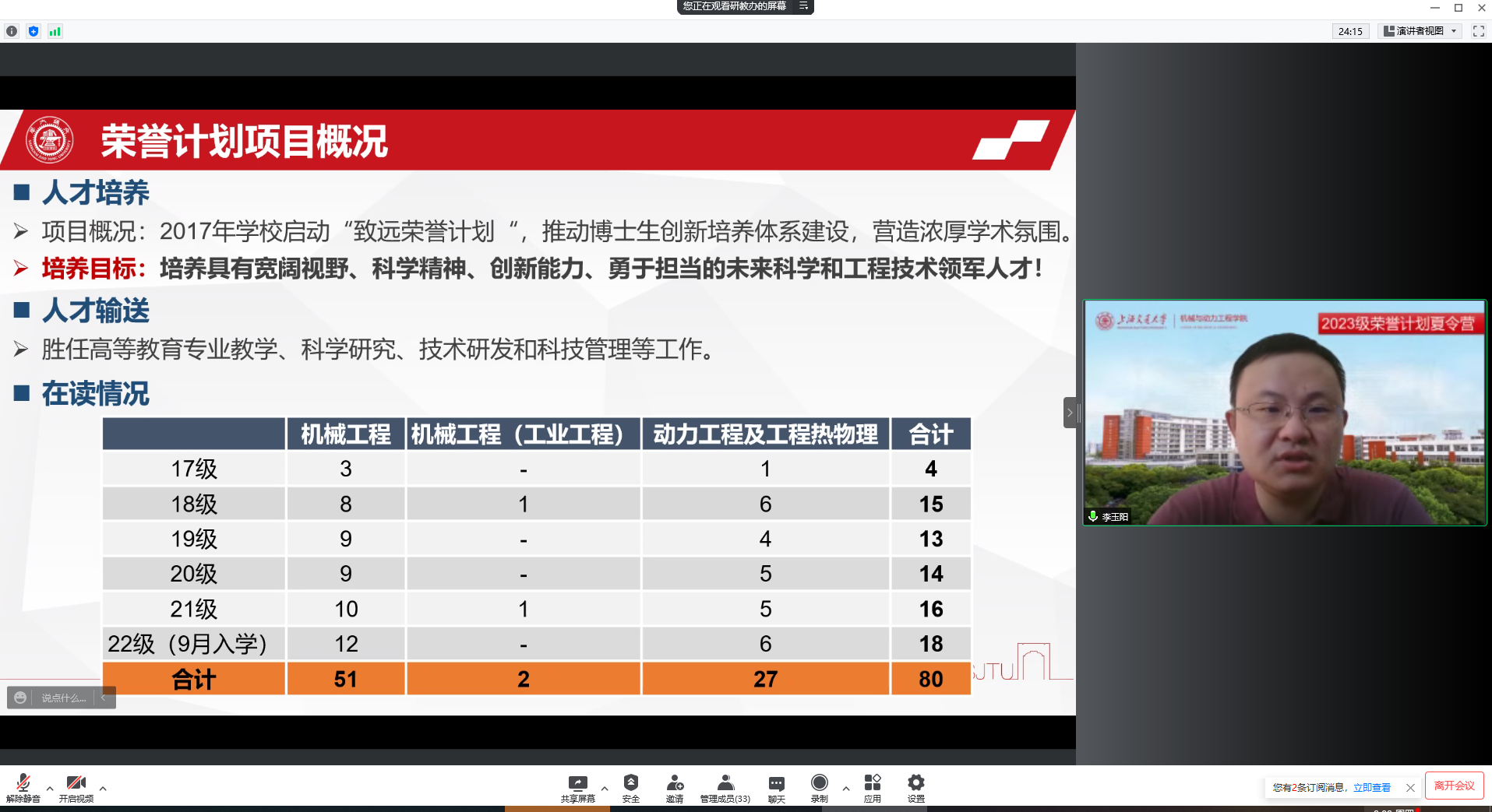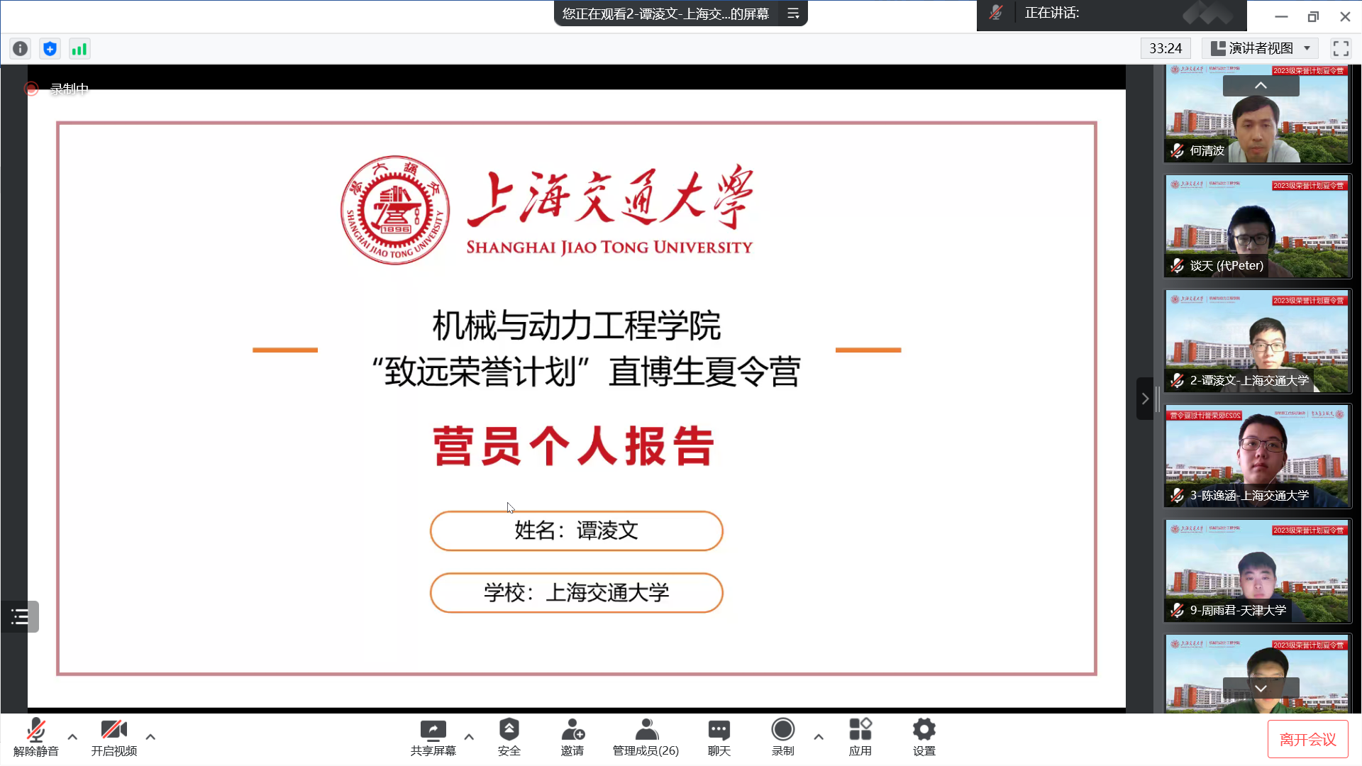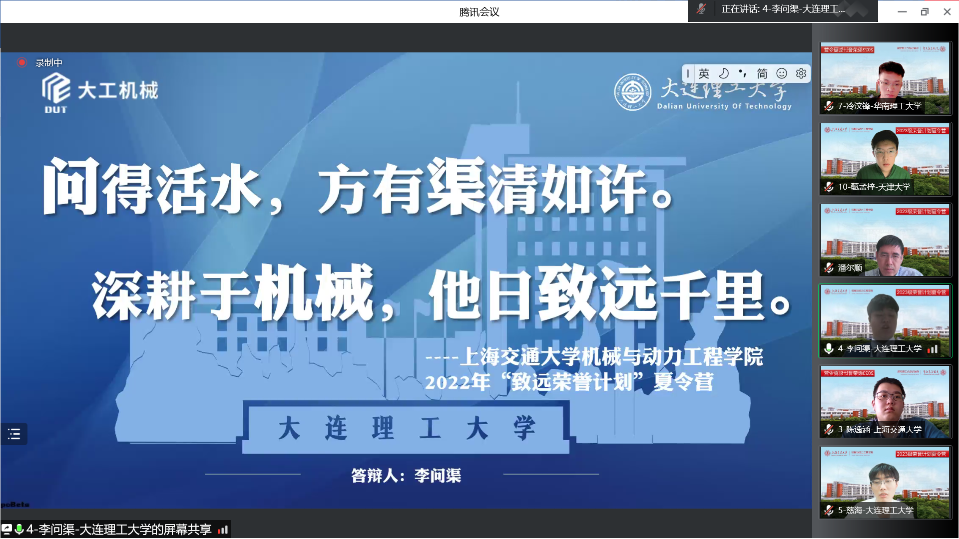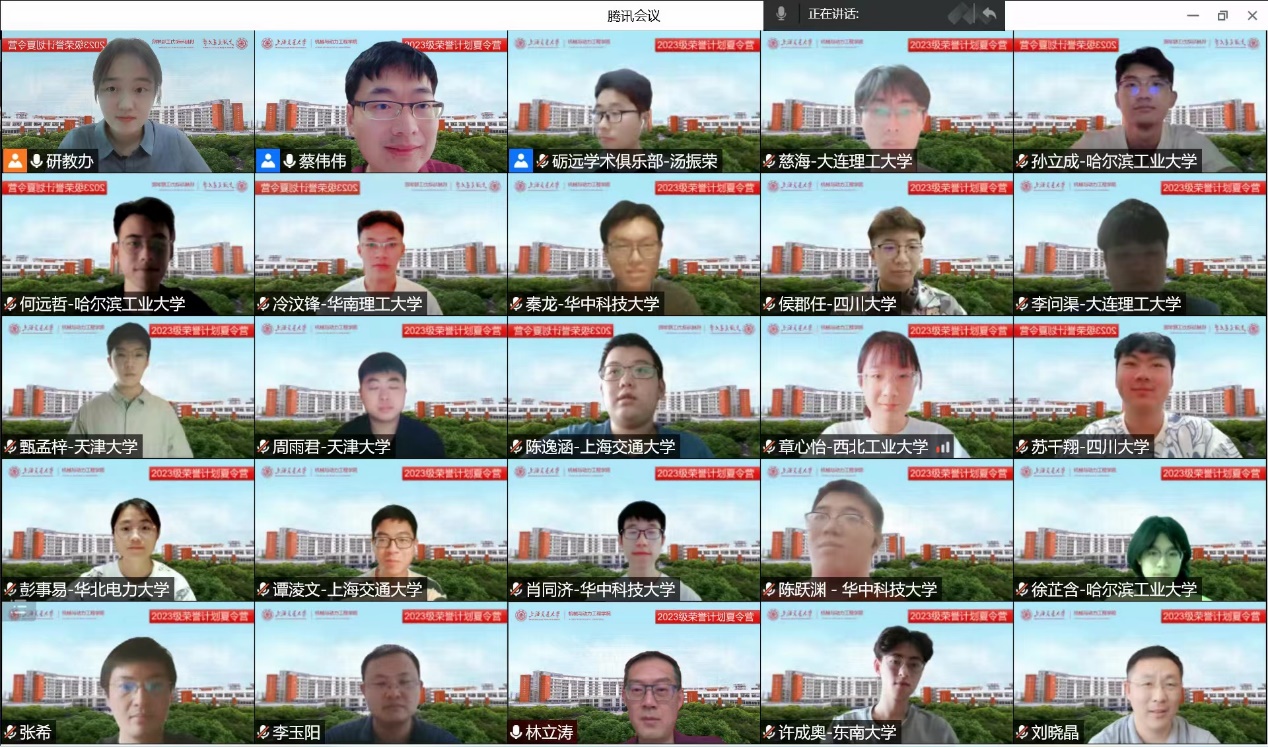 7月14日-15日,365best体育亚洲官网第三届“致远荣誉计划”直博生云端夏令营成功举办。学院院长杜朝辉教授、党委书记林立涛教授、副院长李玉阳教授、重大装备设计与控制工程研究所所长高峰教授、制冷与低温工程研究所吴静怡教授、燃料电池研究所所长章俊良等,与来自365best体育亚洲官网、西安交通大学、哈尔滨工业大学、华中科技大学、天津大学、大连理工大学等14所高校的20名优秀学子在云端相聚,进行深入浅出的学术交流,完成思想与智慧的碰撞。