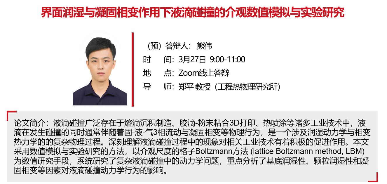 【答辩公告】界面润湿与凝固相变作用下液滴碰撞的介观数值模拟与实验研究-3月27日