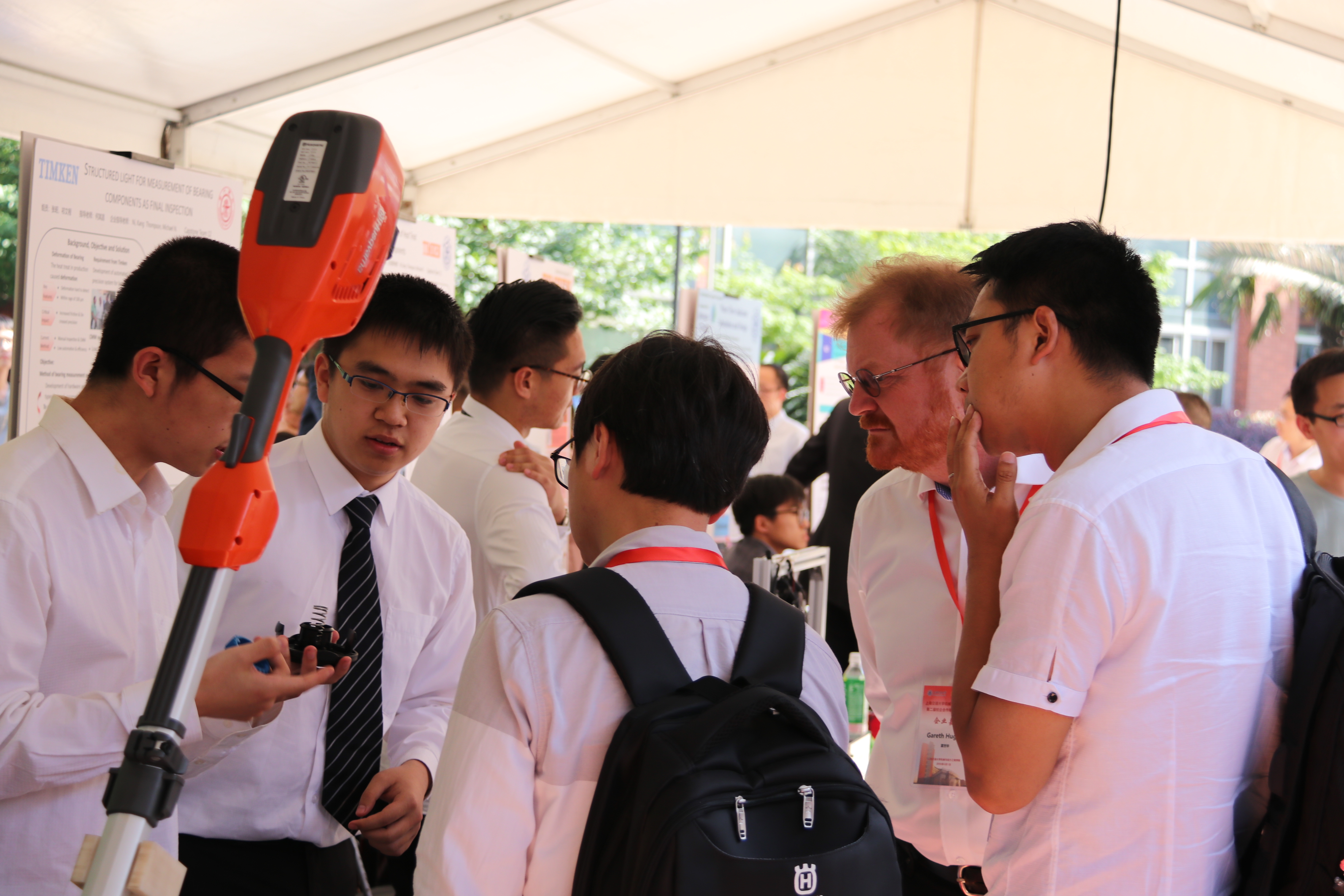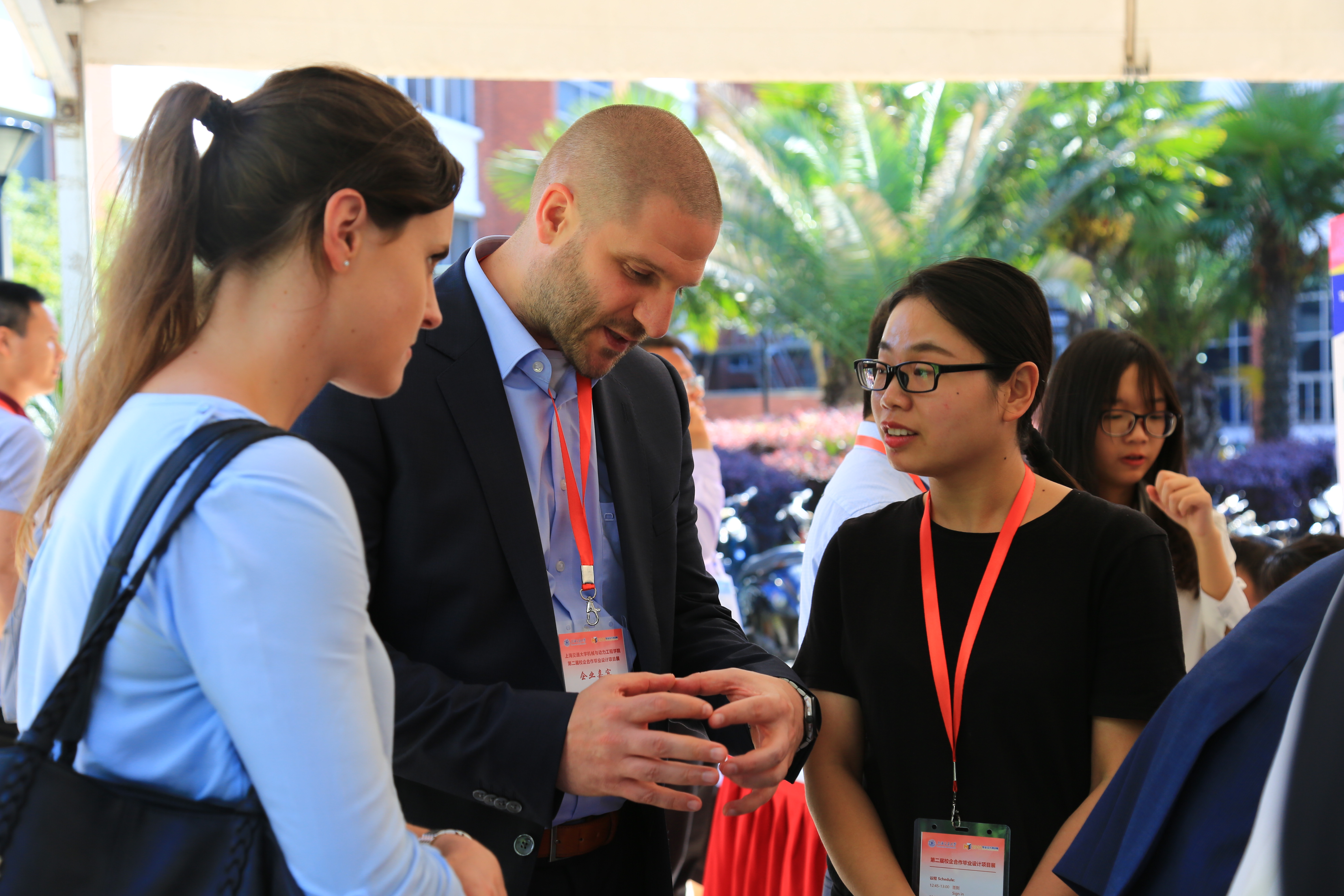 此次校企合作毕业设计项目展共展出了423名学生历时6个月完成的128个企业项目,这些项目分别来自于上汽大众、上海电气、泛亚汽车、Kern-liebers、Husqvarna、Johnson Controls、Timken等国际知名企业。每个项目由3-4名上海交大学生合作完成,其中11个国际毕设项目分别是与美国宾州州立大学、加拿大多伦多大学学生合作完成。发散的思维、工程学机理的应用、优化的设计方案、精心制作的仿真模型……一件件设计作品展现了学生的奇思妙想和扎实的工程实践能力,为前来参展的企业嘉宾和校内外师生提供了一场创意盛宴。毕业设计项目展现场,参展学生向嘉宾介绍各自项目的设计理念、思路等,校企嘉宾与学生展开积极的互动交流,并提出更优化的建议,学生们也感到受益匪浅。