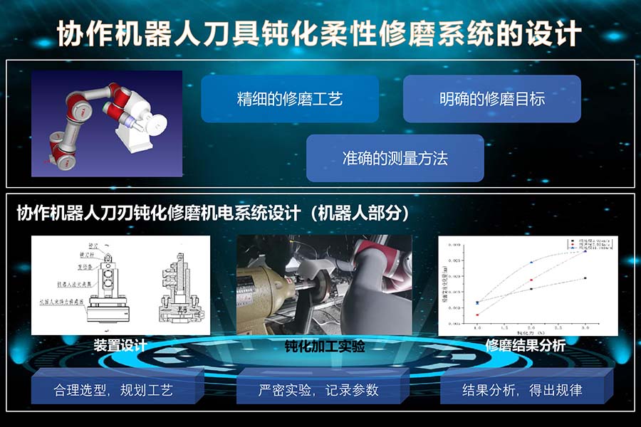 (1)设计一套机器人刀具刃口钝化修磨装置,包括协作机器人和末端夹具系统设计、钝化修磨单元选型和设计。