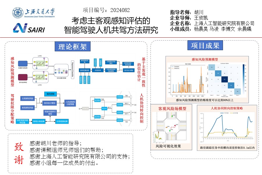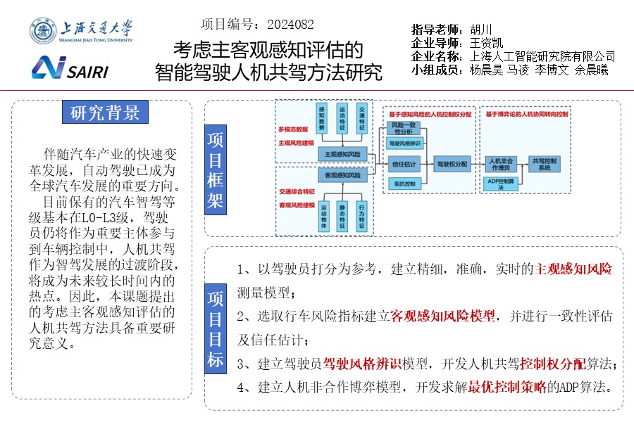 伴随汽车产业的快速变革发展,自动驾驶已成为全球汽车发展的重要方向。目前保有的汽车智驾等级基本在L0-L3级,驾驶员仍将作为重要主体参与到车辆控制中,人机共驾作为智驾发展的过渡阶段,将成为未来较长时间内的热点。据此本项目设计了一套考虑主客观感知评估的人机共驾方法:构建了一个考虑主客观风险的信任估计模型,并在此模型的基础上设计人机控制权分配策略,最终基于博弈思想实现控制策略,形成一套完整的基于主客观风险的人机共驾协同控制方法,提升自动驾驶系统的安全性、可靠性。