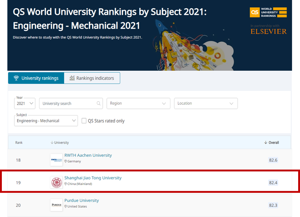 QS World University Rankings ranked SJTU’s Mechanical, Aeronautical & Manufacturing Engineering subject #19 for 2021 among the global universities in its category, and Mechanical Engineering is the highest ranked subject in Shanghai Jiao Tong University.