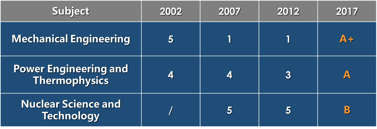 School of Mechanical Engineering has three disciplines: Mechanical Engineering, Power Engineering and Thermophysics, and Nuclear Science and Technology, all of which are in a leading position. Mechanical Engineering discipline is at the first place in the discipline ranking by Ministry of Education of China, and Power Engineering and Thermophysics discipline is in A class (top 5%) among the colleges of China.