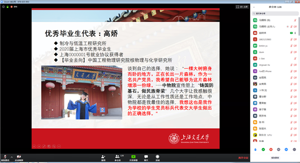 3月29日下午,365best体育亚洲官网“思源致远 扬帆远航”2020届研究生毕业生党员远航教育大会在线上举行。校学生工作党委书记刘宇空对毕业生党员提出三点希望:一是不忘初心,坚定信念,永葆共产党员鲜亮的本色,在国家富强和民族复兴的伟大征程中实现个人价值;二是敢于挑战,勇担使命,在实现中华民族伟大复兴的征程中贡献力量,在实现中国梦的伟大实践中书写人生;三是终身学习,扎根行业,在服务社会中增长才干,在党和人民需要的地方绽放生命之花。学院党委书记杜朝辉以“不忘初心,坚定信念,努力奋斗”为主题,为毕业生上了一堂生动的党课。他希望各位毕业生党员牢记“饮水思源,爱国荣校”的校训,在各自的岗位上不断努力,为行业和国家发展做出新的贡献。2011届博士校友、航天科技集团一院二一一厂副总经理王贺以“思源致远,扬帆启航”为主题,为毕业生党员分享在交大求学及工作中的经历感悟。他鼓励同学们将个人利益与国家、集体的利益结合在一起,做好眼前,踏实工作,放飞理想。17级硕士毕业生代表吴增辉在发言中表达了自己对学校和学院的感恩之情,分享了自己的成长,号召毕业生党员同学们要有投身“国之重器”重点领域建设的爱国情怀,怀有“把小我融入大我,把青春献给祖国”的信念,在“与祖国同行”中奉献无悔青春。