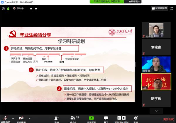 制造所、智能制造所、振动所、知识工程所、现代设计所、机器人所、机电所、薄板所、智能汽车所、叶轮所、内燃机所、热能工程所、工热所、制冷所、燃料电池所、核学院等研究生党支部分别开展毕业生成长感悟及经验交流分享会。毕业生们分享在读期间的学习、科研、生活和求职等经验,给同学们一些建议:一是珍惜学校提供的良好学习环境和资源;二是在科研工作中不仅要扎实专业技能,也要注意知识面的广度;三是做好生涯规划,了解行业发展的同时,对接国家战略需求,把个人价值的实现和国家战略需求结合起来,养成投身国家重点行业的家国情怀。