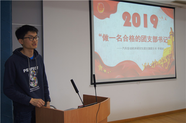 汽车发动机研究所团支书李黄河分享了“做一名合格的团支部书记”的心得体会。他从“这半年,我们做了什么”、“存在的问题和努力方向”和“下一步工作思路和措施”三方面进行分享,并结合4月的主题团日活动介绍了系所活动的组织经验。他表示下一年将更加脚踏实地、扎扎实实开展工作,为支部强化学习交流、科研分享、社会实践和思想提升这四大阵地。