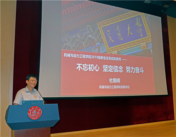 杜朝辉以“不忘初心,坚定信念,努力奋斗”为主题,为新生党员带来第一节专题党课。他结合党的十九大主题“不忘初心,牢记使命,为实现中华民族伟大复兴的中国梦不懈奋斗”,向新生党员们描绘了当今中国第一个百年目标既将实现,正从全面建成小康社会迈向社会主义现代化强国的美好图景。对比以往艰苦的求学经历,他指出了同学们在信念坚定、思想觉悟上的不足,并且对同学们提出期望,要求新生党员立足新时代,抓住时代发展机遇,以更高的起点和目标来从事科研创新工作。他强调,新生党员应该做好学生,更应该做好党员,在学习和品德上都要起到模范带头作用。他带领新生党员学习了《党章》中党员的八项义务,指出新生党员要认真学习党章,不断提升自己的党性修养。他提出,青年党员应该要做到“四讲四有”、“四个合格”,并以此来规范自身的行为。他重点讲述了坚定信念的重要性,对“理想”和“信念”两个关键词进行了深入剖析。他通过列举杰出校友钱学森、范绪箕、林忠钦等优秀党员在科学研究上的奋斗历程和工作生活中的优良作风,勉励同学们勤恳踏实,潜心科研、奋发图强,他通过讲述王如竹教授、易培云副教授等的事迹鼓舞同学们新时代青年大有可为,希望同学们“勤奋为学、饮水思源”。他希望同学们传承“交大精神”,即求真务实的科学精神,救国兴国的爱国精神,与日俱进、敢为人先的创新精神,激励同学们崇尚科学、创新攻坚。他还提到,同学们要提升自己的思想境界,有长远的目光,在学习中要有科研的精神,在科研中要有学习的态度。最后他希望同学们要培养自己的家国情怀、国际视野、行业理想,加强使命感与责任感,不辱使命,不负重托,未来选择到国家需要的地方建功立业。