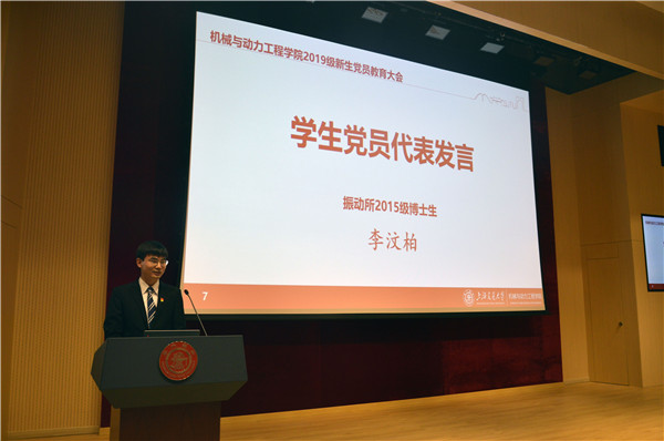 振动、冲击、噪声研究所2015级博士生李汶柏分享了自己在交大的求学经历。他表达对学院与老师的辛勤培养的感恩之情,庆幸自己在交大的学习生活中成长和收获了很多,并逐渐找到了自己的奋斗目标和人生方向。博士四年期间,他获得国家奖学金、学校和学院的研究生“学术之星”等荣誉,经过四年的积累,今年还有幸入选博士后创新人才支持计划。回顾求学之路,他为研究生新生提出三点建议:尽早确立目标,坚定信念;积极主动,善于学习;学会规划时间,勤奋努力。他指出科研过程是艰苦的,却是有价值的。最后他引用习近平总书记的话“青年一代有理想、有本领、有担当,国家就有前途,民族就有希望”,希望新生同学立一等志向,成一等人才,用勤勉和创新为行业的发展、技术的领先、国家的进步贡献自己的力量。