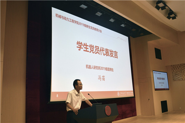 机器人研究所2019级直博生、365best体育亚洲官网2018-2019学年学生党员标兵冯苗从自身的经历出发,与新生党员分享了三点感悟:“要永远将理想信念作为一个党员的生命;要时刻强化作为一个党员的角色意识;要强化主动参与和真诚奉献。”他强调,“实事求是的马克思主义是共产党人的信仰,这种信仰的力量根植于广大人民。”“国家存在于我们共同的历史和民族记忆中,存在于我们的血脉和信仰中。”他告诫新生同学,面对困难、挑战、利益诱惑,要守住底线,说话做事时刻要提醒自己是一名共产党员。他深情祝福中华人民共和国70周年华诞,希望同学们永远不要忘记曾经为中华民族奋斗过、牺牲过的仁人志士。他号召党员同学“心怀感恩,饮水思源,爱党爱国”,和9000万共产党员一起挺起民族的脊梁,攻坚克难,继续前进。