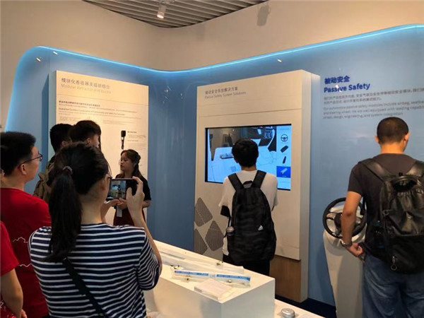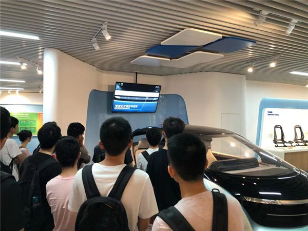 首先,同学们参观了延锋的产品展厅。展厅内陈列了车辆的种种零部件,从内部的智能座椅到外部的轻量化保险杠,从细小的无线充电模块到大型的座椅骨架,无一不展现着延锋在汽车零部件领域的创新。此外,概念车XiM17的模型和工厂加工流水线视频更是展现了延锋在智能化方面的探索与成就:智能化的汽车座舱与智能化、无人化的加工流水线。整个展厅的关键词,应是“轻量化”、“新材料”、“智能化”、“创新配色方案”,体现的是延锋在更轻更薄的零部件、更智能化的汽车内饰、更客制化的配色方案等等方面的努力。