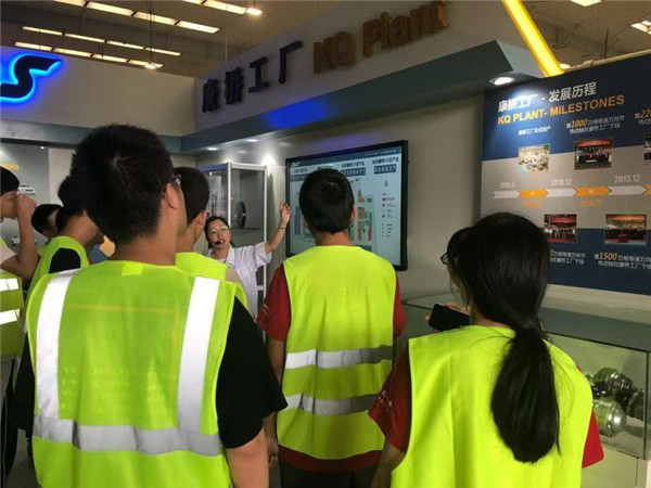 进入车间,首先看到的是安全培训区,这里陈列了各类安全防护设备与各类受伤体验,展现了工厂对安全的重视。然后是工厂的培训角,展示了摩擦焊接、总成压装、固定节装配等等技术及各类缺陷件的公示,体现的是纳铁福制造中的高科技与检sa验中的严要求。在生产运营信息中心,同学们看到的是工厂对产品质量、生产效率实时的总体把控,了解到了大工厂对产品把控之细致。接下来,我们走进工厂的生产线。自动化的加工中心、如同自动售货机一般的取刀机器都展现了纳铁福工厂在自动化、智能化方面的成就以及工业4.0、人机协作理念的体现。