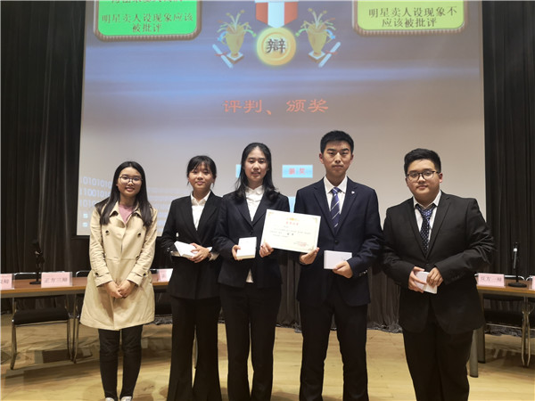 本次“新风杯”辩论赛,反方持“明星卖人设不应该被批评”观点获得冠军,正方获得亚军。比赛最后由戴雨吟和郑思航为冠亚军以及本届“新风杯”八位“最佳辩手”颁奖。至此,“新风杯” 辩论赛在同学们热烈的掌声中落下了帷幕。