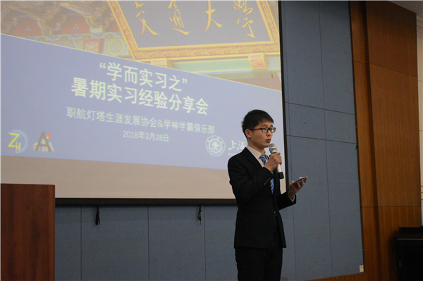 3月28日晚,“学而实习之”暑期实习经验分享会在逸夫楼200号举办。本次活动由职航灯塔生涯发展协会和学神学霸俱乐部联合举办。机械动力学院学生胡寒江、欧阳崛和叶维熊受邀出席讲座并分享自身实习经历。活动由韩潇主持。