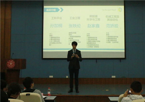 工业工程专业的张轶伦同学作为博士嘉宾,对从本科到博士的路程作了生动的描述。他介绍了自己的课题经历,参与的各种项目以及进行的学术研究。同时告诫学弟学妹专业的平均水平并不代表自己的水平,希望学弟学妹们要乐学善学。