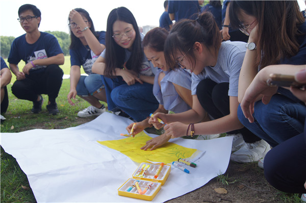 开营仪式后,同学们在机械动力学院大草坪参加了体验式培训。在破冰环节中,同学们分成三组,选出了队长、队秘,设计了队名、队旗等;在接下来的团队建设活动中,大家更是团结合作、互相配合,在欢声笑语中拉近了彼此的距离。