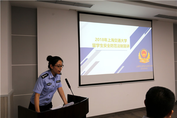 文保分局涉外科赵警官带来了留学生安全防范法制宣讲。她介绍了几种常见的诈骗方式以提高留学生的安全防范意识,并讲解了宗教活动、消防安全、道路安全和治安管理等法律法规。