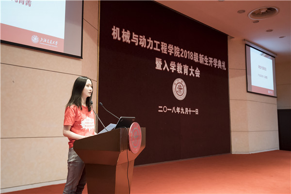F1802009班冯育菁同学代表2018级新生上台发言。她讲述了自己选择机械专业的缘由与情怀,向同学们提出了初心不改、共同进步、继承交大精神的期愿。