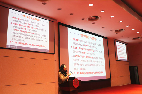 王丽伟首先向全体新生介绍2019年春季专业分流规则,介绍了机械工程、能源与动力工程、工业工程及新能源科学与工程四个分流专业的研究方向、专业课程以及交叉模块课程的设置,引导全体同学积极为春季的专业分流做准备。