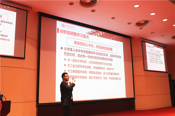 赵家鑫首先从“大学应该怎么过?”,“学业、科研、学生工作等等如何平衡?”和“出国、国内读研、工作怎么选择?”三个问题入手,分享了自己的大学生活经历,鼓励学弟学妹们寻找自己的远大目标,在尝试中思考,把控自我爱好,优化时间管理并最终选择适合自己的发展方向。