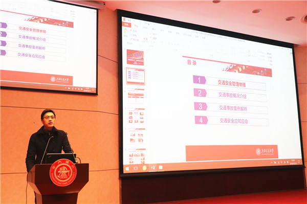 王文章给全体新生介绍了思政管理团队、本科教务管理团队配置,介绍了F18级最新基本情况。同时面向全体新生开展《全国交通安全教育日宣传教育》,使同学们对高发事故的原因、校内交通事故的处置、交通安全常识加深了了解和认识。