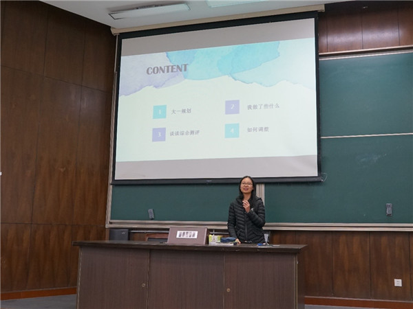 来自大二的金思雨主要从综合测评方面分享了提高素拓成绩的方法,包括志愿公益的选择、学生工作的参与以及学业成绩的提升等,她指出时间宝贵,精力有限,学习永远放在第一位,有富余精力再考虑其他方面。