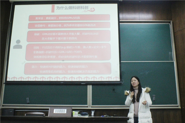 来自大四的范娇姣主要从科研方面入手,讲述了做科研的理由、方式以及她个人在科研过程中的经验教训。她对比了校内外的科研项目,以及各类科研赛事,鼓励同学们在保证学业成绩的情况下积极投身于科研。