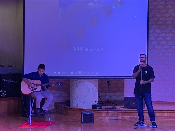 除了经验交流分享外,活动过程中也穿插了一些游戏和文艺表演。通过游戏环节,能够帮助留学生同学尽快熟悉彼此。进行“抢座位”和“吹气球”游戏时,台上台下气氛热烈,不时传出阵阵掌声和笑声。留学生会文化部成员Ariful和他的朋友合作,为同学们带来了优美的吉他演奏和动听的英文歌曲,将活动推向了又一个高潮。