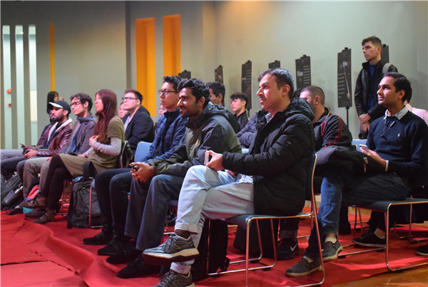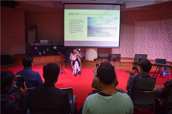 本次活动主要分为两个环节,科普表演和互动体验。首先,笛箫协会的同学们用英语向留学生依次介绍了扬琴、琵琶、柳琴、二胡、笛子等中国民族乐器,涵盖了乐器的历史、构造、演奏方法与技巧等方面,并逐一演奏了各个乐器的经典曲目,如《节日的天山》、《春到沂河》、《牧民新歌》等,现场留学生同学赞叹不已,纷纷拿起手机拍摄。