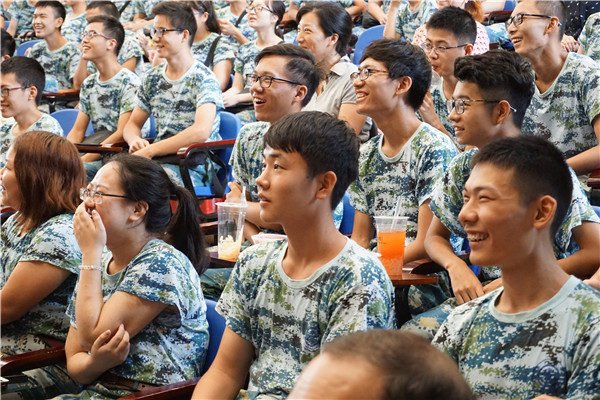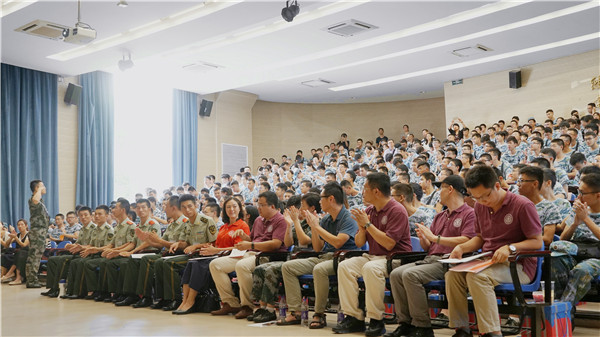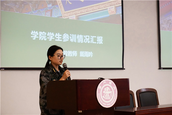17级年级思政、九连指导员戴雨吟首先为大家作机械动力学院学生参训情况汇报。在短短5天时候里,机动连队已2次冲得沙场争锋旗,5次获得标兵连称号,获得团部营部的大力嘉奖。戴雨吟针对军训中的安全工作、科学训练、政工工作和后勤保障工作作了大致的阐释。