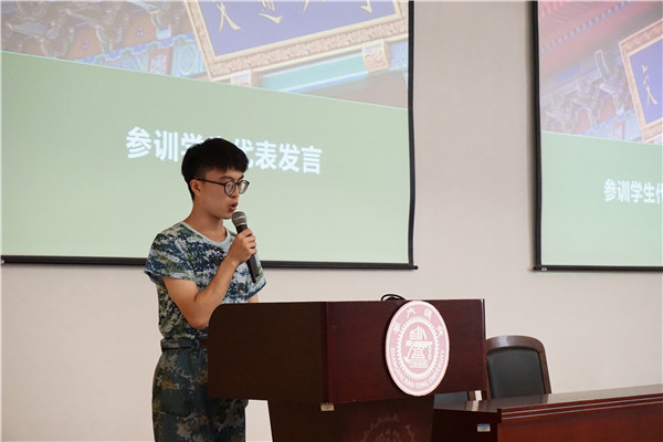 来自十连的魏玉烜同学代表机械动力学院全体参训学生向家长、老师、教官和指导员们的辛勤付出表达了真挚的感谢。同时,他回忆了军训期间丰富多彩的活动,肯定了军训在改变生活习惯、塑造人格方面的作用,表达了圆满完成军训任务的信心和决心。