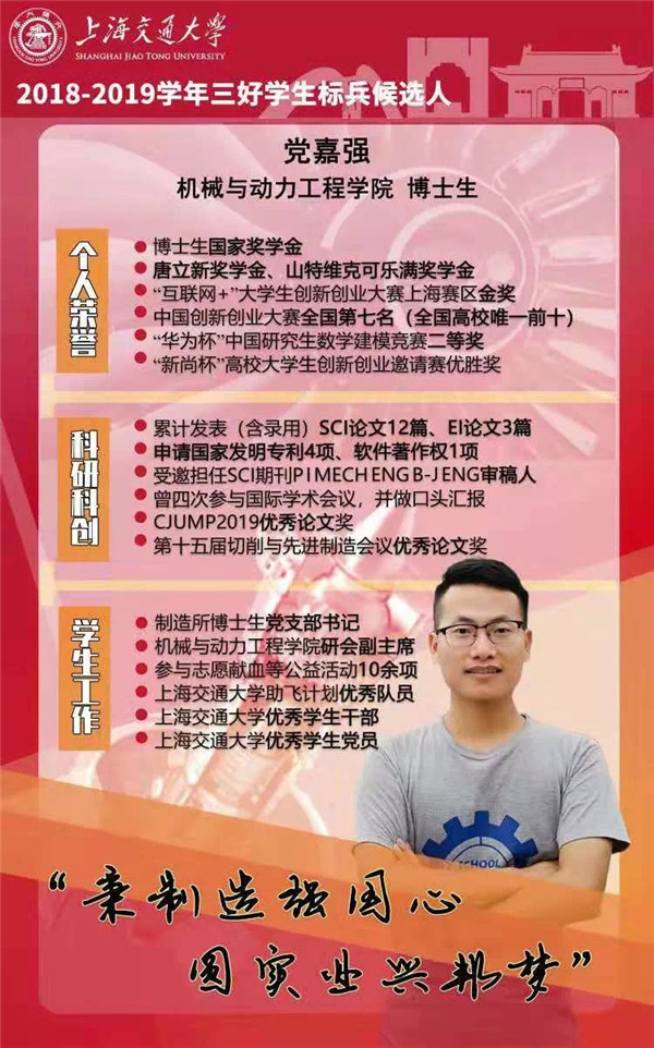 党嘉强是一个全面发展的95后博士生,也是一个心怀梦想的机械制造人。科研学习、学生工作、志愿公益有他忙碌的身影,“制造强国,实业兴邦”是他砥砺前行的方向。在学习的道路上,他努力刻苦,获得博士生国家奖学金和唐立新奖学金;在学术的旅途中,他积极钻研,录用或发表12篇SCI论文;在科创的世界里,他越战越勇,获得上海市“互联网+”大学生创新创业大赛金奖;在学生工作中,他尽心尽责,获得优秀学生党员和省优秀学生干部。