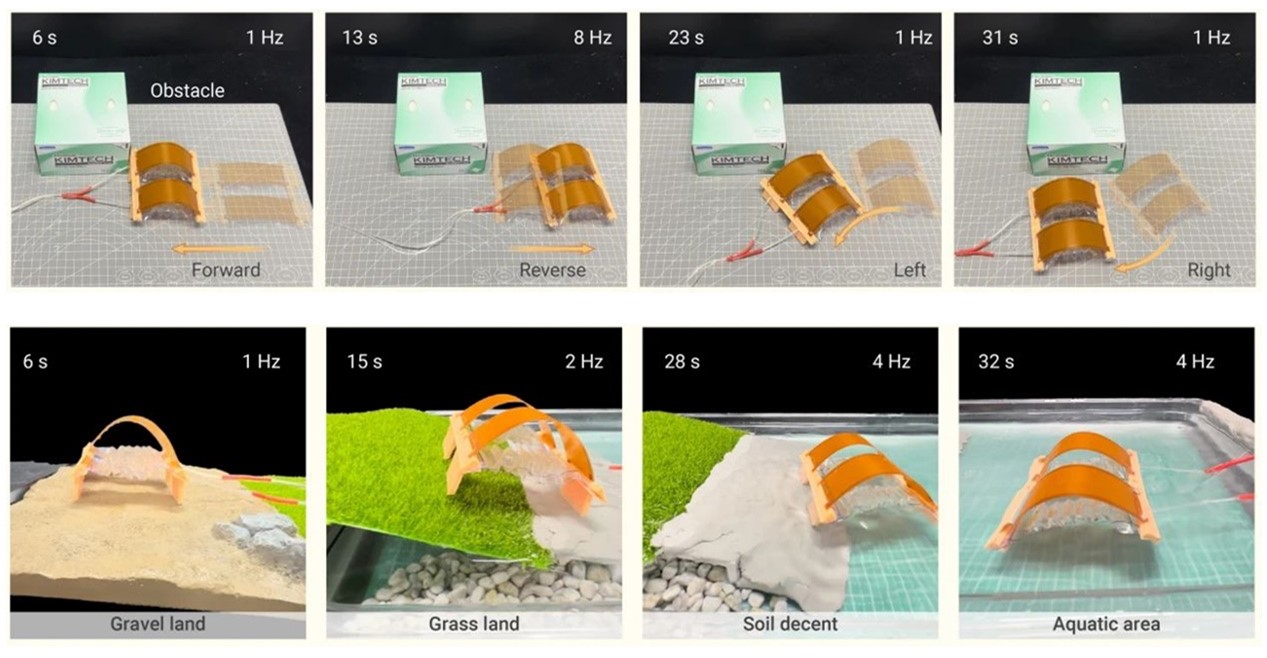 在“自感知—适应”能力的作用下,仿生脊椎软体机器人能够流畅地完成从环境识别、自我决策到主动调节的闭环工作流程,从而高效地完成任务。为了验证仿生脊椎的可靠性,本文设计了一个具有全向运动以及自我避障意识的软体两栖机器人。通过调节机器人的运动姿态以及人工肌肉间的协同驱动能够控制机器人实现前进、后退以及转向运动。机器人展示出对于障碍物的感知与规避能力,以及在水陆两栖多地形任务中的较高效率,验证了仿生脊椎设计的可拓展性以及功能元件和系统的高简洁性。