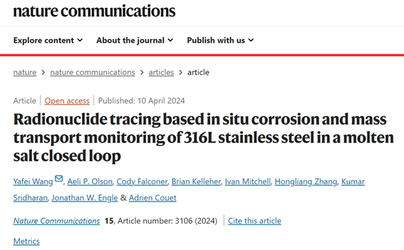 近日,365best体育亚洲官网核科学与工程学院王亚飞副教授课题组在Nature Communications上发表了“Radionuclide Tracing Based in situ Corrosion and Mass Transport Monitoring of 316L Stainless Steel in a Molten Salt Closed Loop”研究论文,通过放射性核素示踪技术,实现了高温熔盐回路结构材料腐蚀深度原位监测及腐蚀产物在熔盐回路中传输和沉积的实时追踪。王亚飞副教授为该论文第一作者和通讯作者。