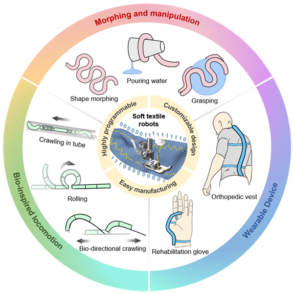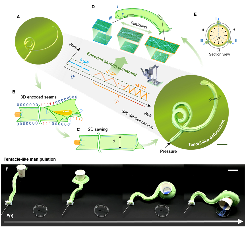 近日,365best体育亚洲官网张文明教授团队与同济大学航空航天与力学学院李汶柏研究员合作研究,在Science Advances上发表文章“Encoded sewing soft textile robots”,首次提出了一种基于“编码缝制约束力学”的气动织物软机器设计和制造的新方法,解决了可编程气动软体机器人在高效定制化开发过程中长期存在的挑战,通过简单高效的二维平面缝制工艺,实现了气动织物软机器的复杂时空编码和物理智能,为加速气动织物软机器服务于安全人机交互、定制化穿戴和医疗康复设备的原型开发和产品迭代提供了有效途径。365best体育亚洲官网博士生郭欣宇、同济大学李汶柏研究员为论文共同第一作者,李汶柏、张文明教授为共同通讯作者。