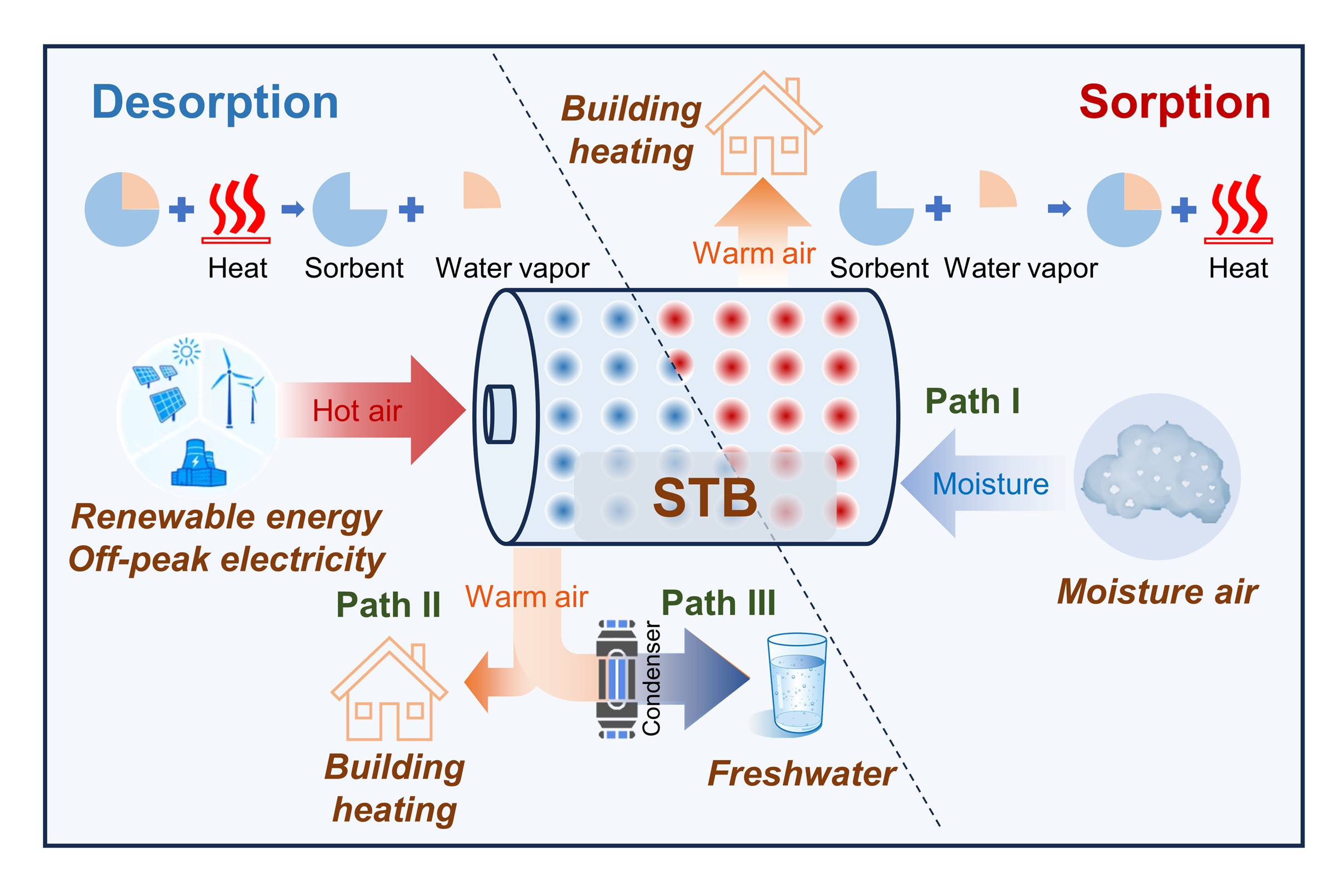 论文聚焦于解决能源和水资源的全球性短缺问题。从能源利用角度,储存可再生能源和非高峰电力可以提高能源利用效率,并缓解可持续能源供需之间的不匹配问题。从水资源短缺问题角度,大气中蕴含的水蒸气是非传统水资源中具有重要潜力的部分,捕捉这部分水资源有望实现随时随地的淡水生产。空气中水蒸气的吸附-解吸循环可以实现两者结合,利用吸附过程实现对大气水分的存储与吸附热的释放,而解吸过程则实现水分的释放与能量的储存(吸附势能),进而构建出从空气中获取淡水与储存吸附势热能的有效途径。