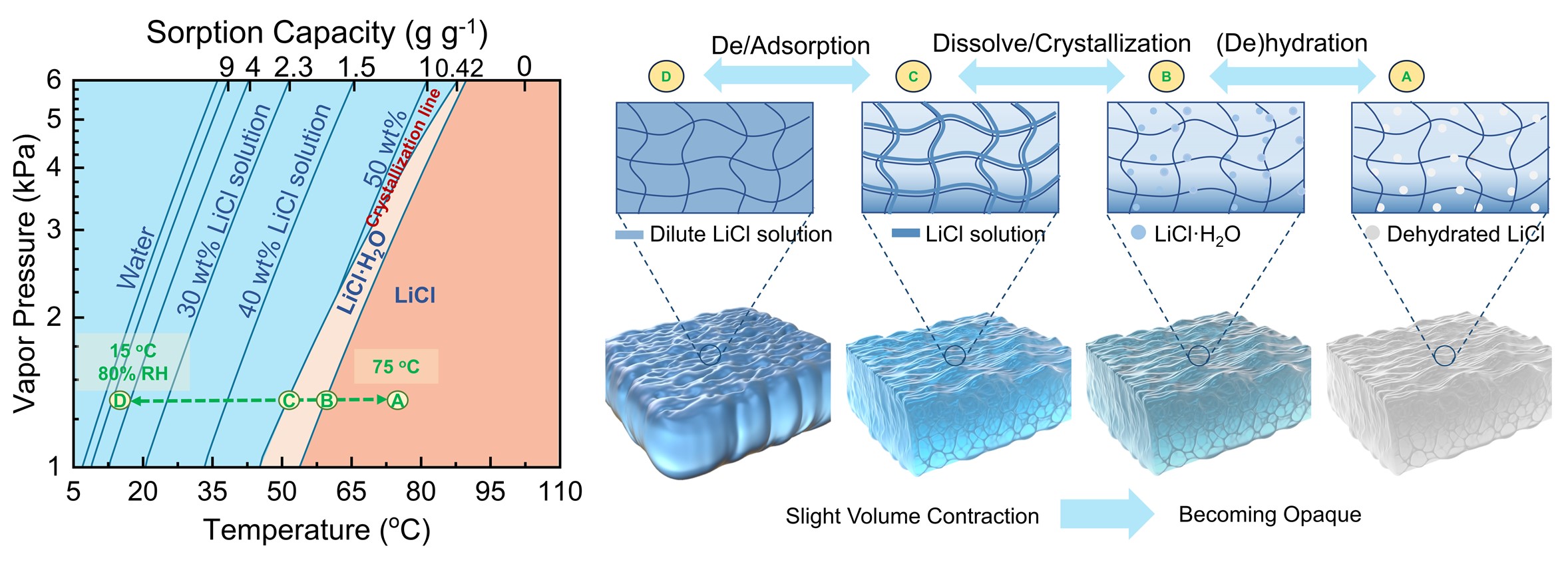 研究的关键技术突破在于吸附材料的开发。研究团队对氯化锂掺杂的聚两性离子-亲水凝胶进行了热力学行为分析,指导了聚合物凝胶的设计和调控,提出了具有高容量和稳定的溶液保留能力的吸湿凝胶。这种吸湿凝胶在20%至85%的相对湿度范围内表现出1.07 g/g至5.82 g/g的显著吸附量,并在80% 相对湿度下表现出9948 kJ/kg的吸附储热能量密度。同时,通过利用这种凝胶材料,构建了储热、放热、取水三种循环路径的集成方法,实现了7779.6 kJ/kg的能量密度、1.7 kW/kg的峰值功率密度和0.97 kg/kg的水生产率,有效地实现了热能的收集存储和水的联产。
