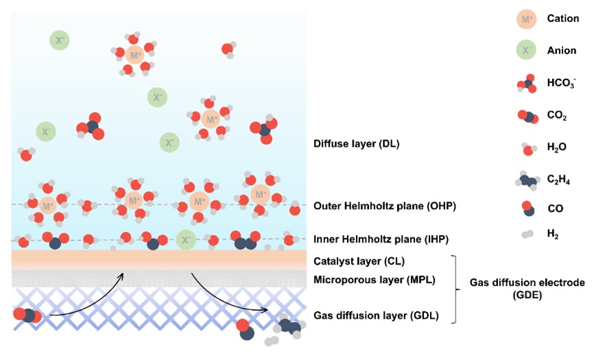 在实验研究部分,作者就电解液效应和传质强化方面提供了原创性工作:在自制的中性流动电解池和膜电极电解池中,展示了0.4-1.0 A cm-2电流密度下最高~70%的多碳产物选择性,其中C2H4法拉第效率可达42%,C2+部分密度~320 mA cm-2,验证了电极外部反应环境调节的重要意义。该论文得到了科技部十四五重点研发计划,国家自然科学基金,上海市科委“科技创新行动计划”等项目的资助。