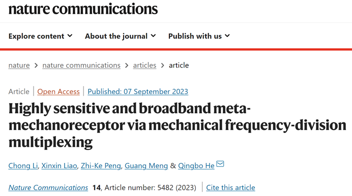 近日,365best体育亚洲官网何清波教授课题组在Nature Communications上在线发表了题为“Highly sensitive and broadband meta-mechanoreceptor via mechanical frequency-division multiplexing”的研究论文,提出了一种机械式频分多路复用概念,研制出高灵敏度宽频微动超机械感知器。365best体育亚洲官网博士研究生李崇为论文第一作者,何清波教授为通讯作者,孟光教授、彭志科教授、廖昕昕博士为合作者。