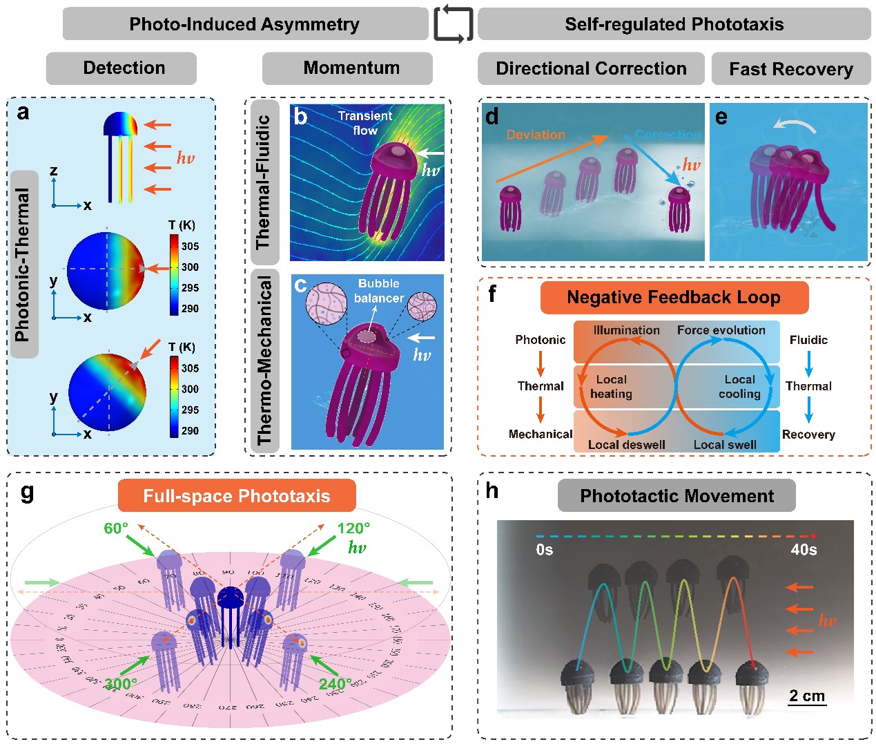 图1:通过自发诱导非对称调节实现全空间趋光性的示意图