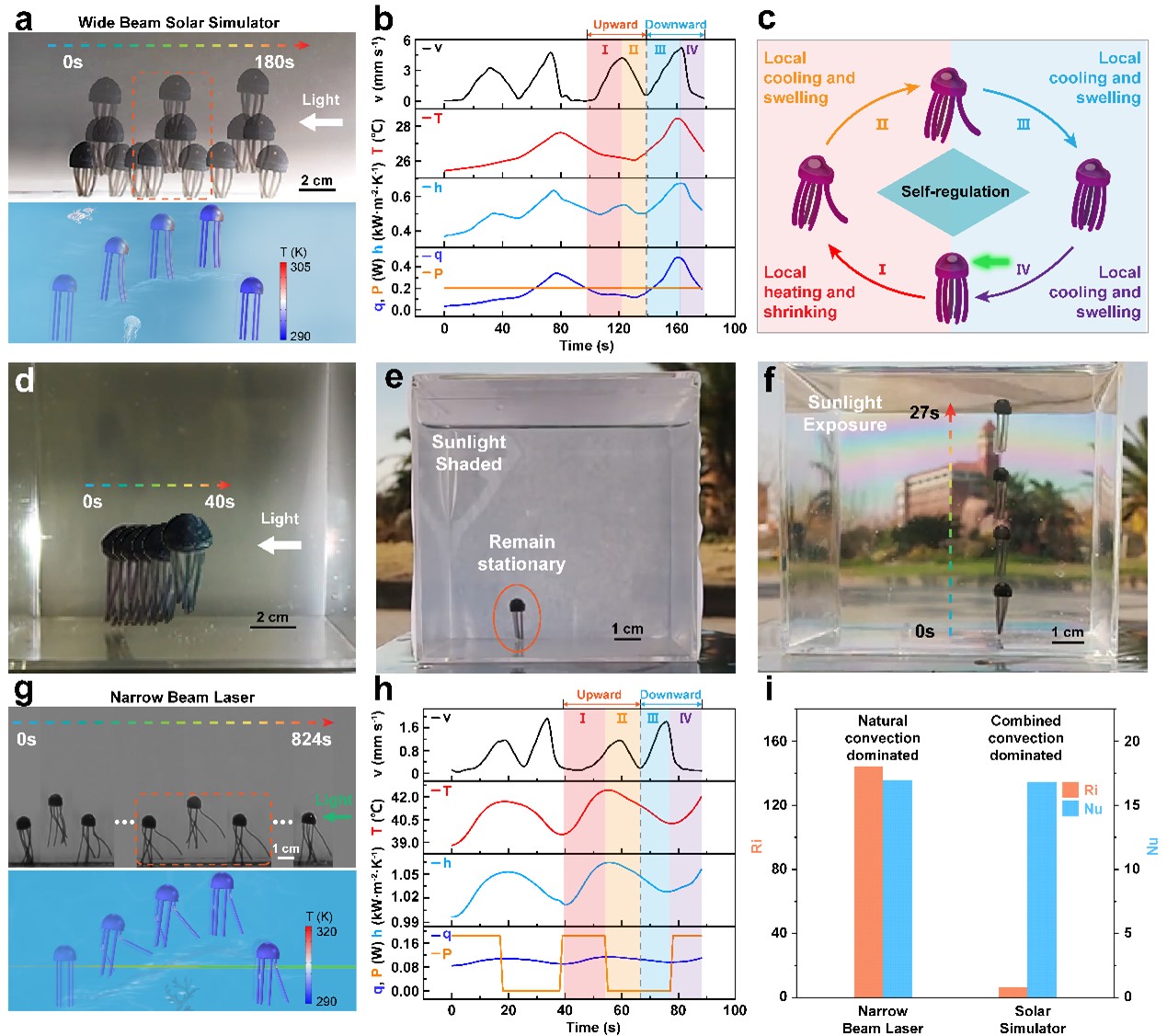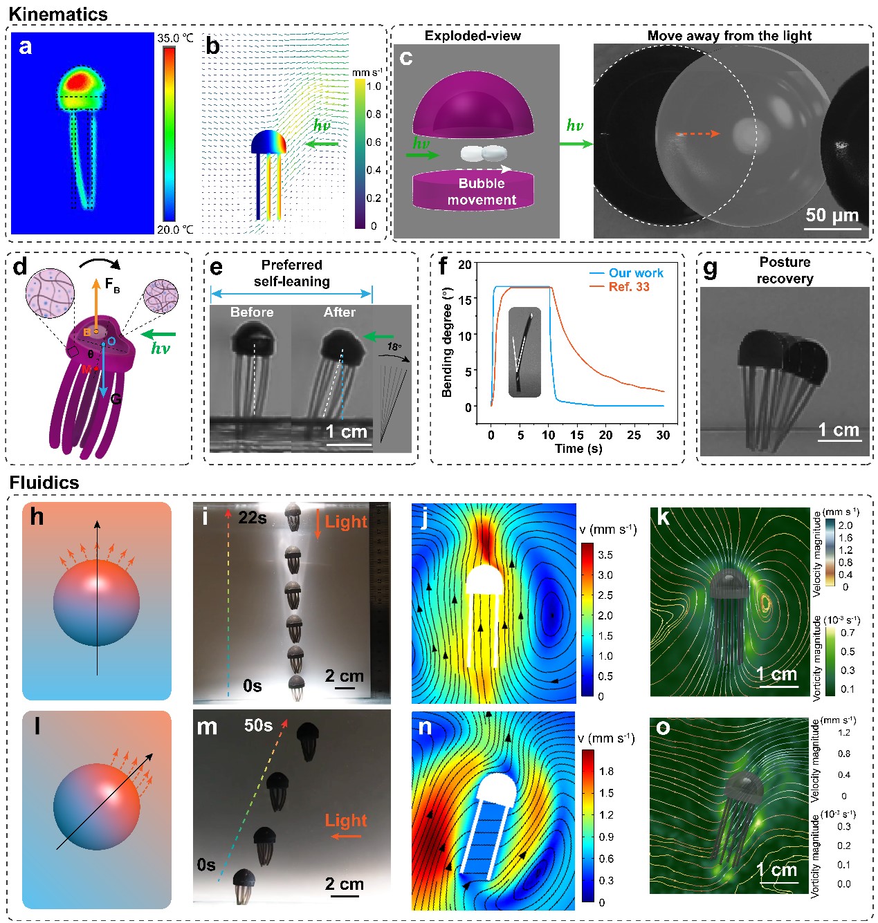 在光照条件下,PTV利用定向光子能量引发温度、流场和几何形态上的非对称性。光子诱导的多场可逆非对称性使PTV能够对任何入射方向做出响应(图1a),从而产生可提供动力的向光流体运动(图1b),并自发地采取最佳姿态进行低阻力的向光游动(图1c)。为了避免因受热表面引起的上升流而产生的偏移运动,PTV能够自适应地增强受热表面的对流换热,从而为纠正方向偏差提供负反馈(图1d)。此智能系统采用一种快速驱动和恢复的刺激响应水凝胶为基质材料,对来自不同方向的光照能做出快速响应(图1e)。高灵敏度和可逆的化学机械反应使其能够在温和的光照条件下(<1 Sun),实现对全空间的向光性和精准操纵(见图1g、h)。
