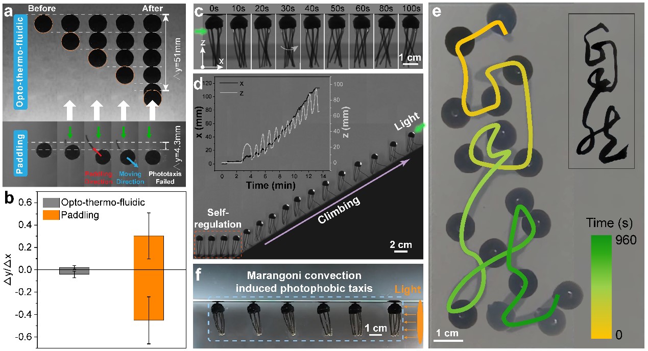桨状触手获取动量时容易与激光束错位,由光-热-流体驱动的PTV在较长距离上表现出鲁棒的趋光性却几乎没有方向偏差(图4a、b)。将六根偏离中心位置的触手巧妙地级联,PTV能够自适应的旋转前进(图4c)。响应性触手会向光源方向弯曲并抵消倾覆力矩,从而在PTV爬上坡道时提供额外的稳定性(图4d)。由于聚合物基体自发诱导的非对称性和快速恢复特性,PTV的定向响应是即时的。PTV具备灵活操控的能力的同时还具有出色的方向和位置分辨率。在恒定光源的连续变化角度下,PTV可以完美地模仿中国书法汉字“自然”(图4e)中复杂的笔画运动。与在水面浸没时的趋光性不同,由于马兰戈尼对流效应,当PTV浮在气水界面上时,会避开光线(图4f)。