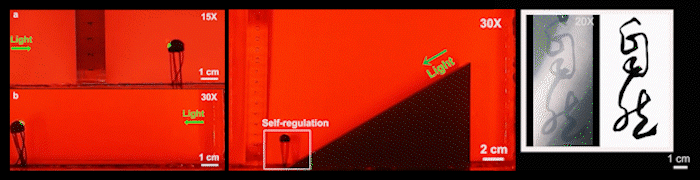 在海洋中,有一些漂浮的小生物能感知到水中光线的变化。它们可以根据光线的强弱,自主调整自己的运动,以便捕捉到食物、寻找繁殖的机会,并远离危险。这些生物的调整运动有很多种,包括趋光性、趋涡性、趋流性和趋化性等,让它们可以根据环境的变化,自主选择移动的方向。这种能力让它们看起来有点像在做“决策”。要实现这种“决策”,生物体需要在受到刺激时产生驱动力,并在合适的时候停止驱动。目前,人类制造的一些人工系统也有类似的反馈控制功能,但这些功能往往需要依赖预先编程的电子电路控制,或者人为的遥控操作。 然而,如果不依赖电子控制或人工干预,仅仅使用均匀的材料,我们还很难实现像这些小生物一样,可以无拖线、自主决策地在整个空间内进行趋光性运动。这个领域仍有许多挑战等待我们去克服和研究。