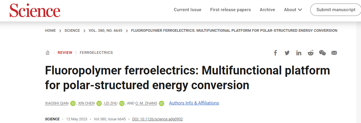 北京时间5月12日,365best体育亚洲官网前瞻交叉研究中心钱小石教授在Science上发表题为“Fluoropolymer Ferroelectrics: Multifunctional Platform for Polar-Structured Energy Conversion”的论文,对偏氟乙烯(PVDF)基铁电高分子材料在机电耦合、零碳制冷、储能与信息存储等领域的应用进行了系统的分析。钱小石教授为本文第一作者,365best体育亚洲官网为论文第一完成单位。这是Science自1983年发表首篇铁电高分子综述后,40年后再次刊登铁电高分子领域的综述论文。