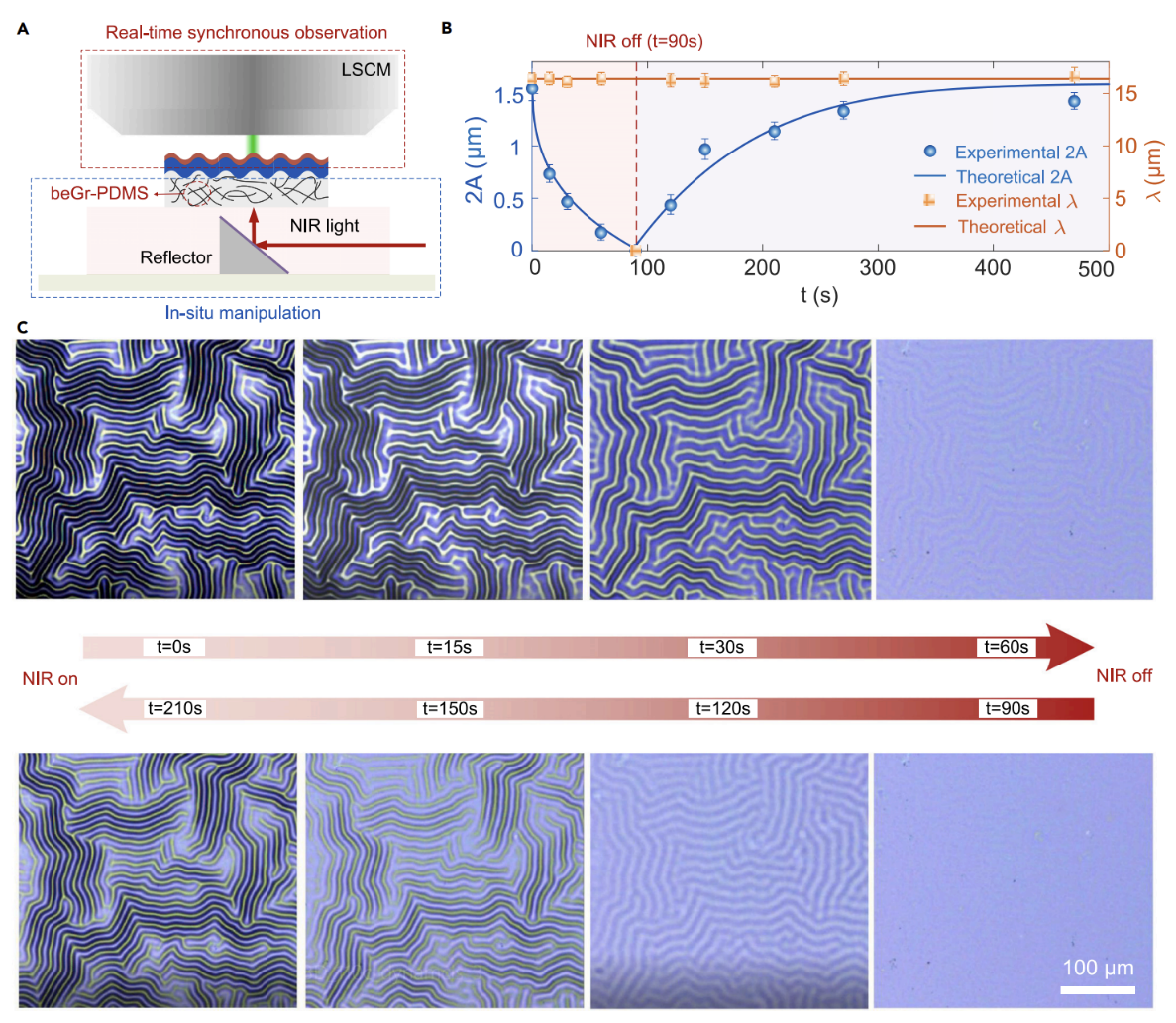 论文提出一种非侵入性和非接触式原位的跨尺度动力学调控方法,实现了单原子层厚度薄膜结构的动力失稳。如图3A所示,设计一个近红外光驱动装置,并控制光强和曝光时间来驱动石墨烯/IML/PDMS三层结构体系发生多次可逆的动力失稳,原位调控了表面失稳结构的幅值。
