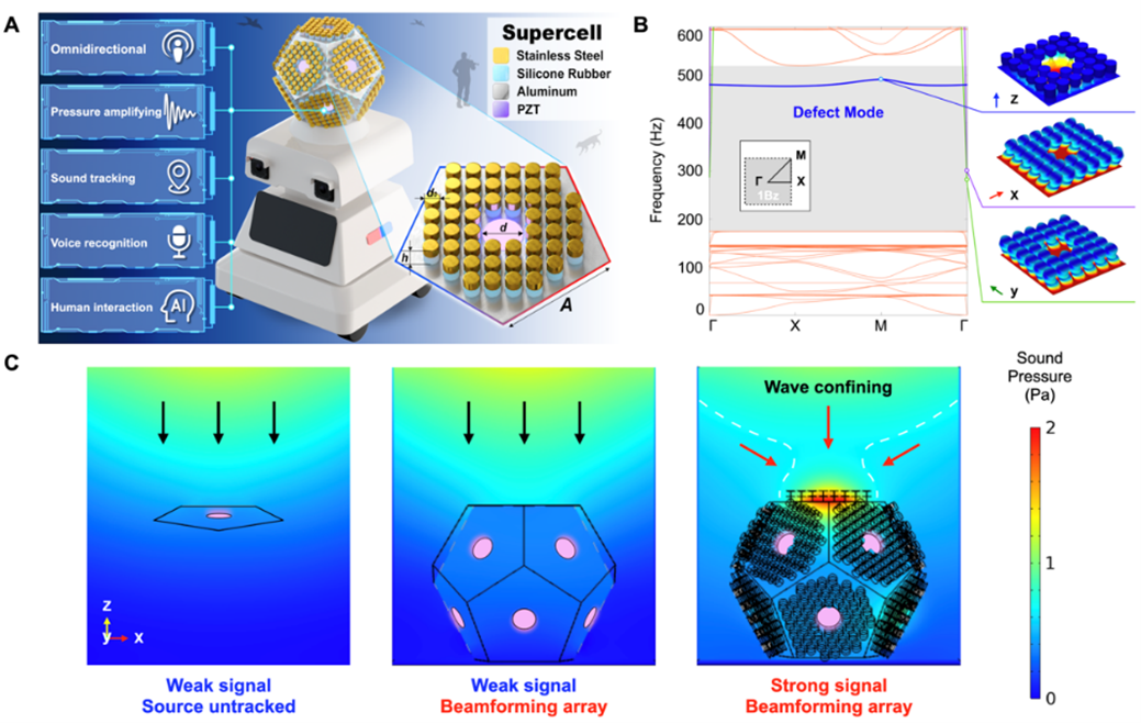 9月28日,365best体育亚洲官网张文明教授团队在Science Advances发表“A wave-confining metasphere beamforming acoustic sensor for superior human-machine voice interaction”论文,提出了声学超球面的新概念,基于超球面缺陷腔阵列局域共振和波束形成原理,率先设计出一种声学超球面声音传感器,展示了全向拾音、声压放大、声源追踪、高性能音频克隆和语音识别等多项功能,即使在强背景噪声环境中也能定位和识别相邻角度的声源,实现了卓越的人机声交互性能。365best体育亚洲官网博士生马珂婧和密西根学院博士生陈虎越为共同第一作者,张文明教授和密西根学院邵磊副教授为共同通讯作者。