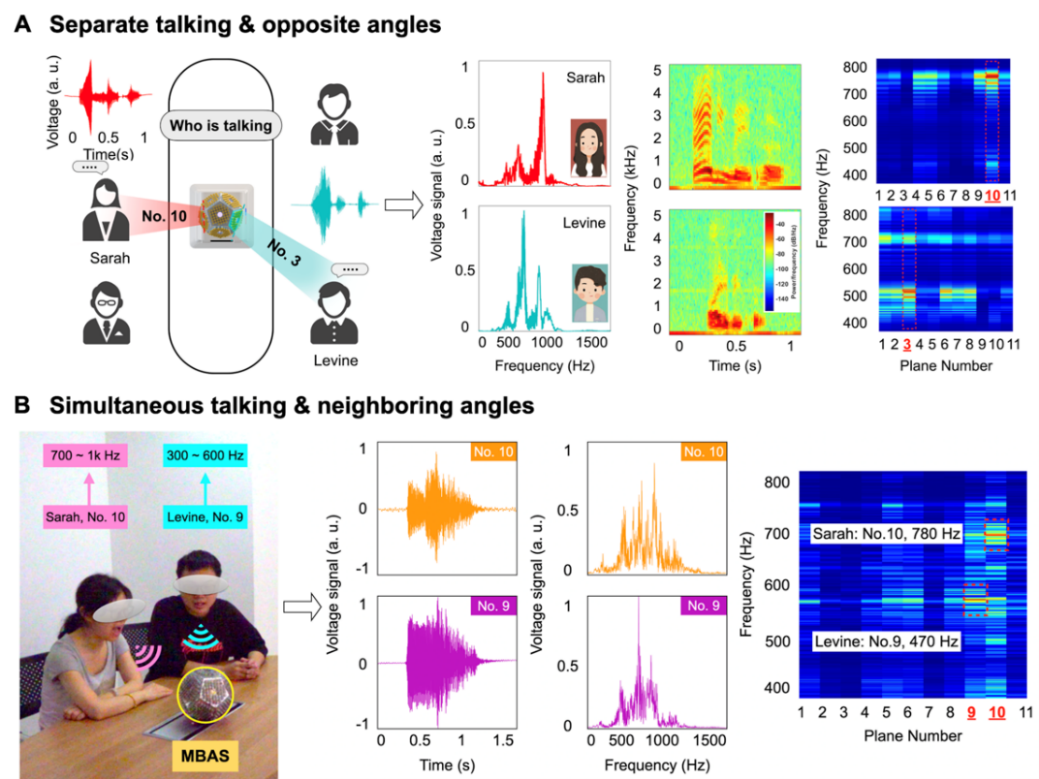 对话是人际交流最常见和最轻松的方式,也是智能人机交互技术的重要发展方向。这一技术需要同时具有超高信噪比和灵敏度的声学传感器,并能够在嘈杂环境中精确识别、定位和追踪多个语音。目前,商用麦克风和新兴的超高灵敏度薄膜传感器都无法解决声波在空间内快速耗散的根本问题,各种智能音箱和会议室全向麦克风都时常难以有效拾音。而声学超材料拥有调制和操纵声波的无限可能性,已被证明能够用于声波的放大和分离。然而,如何利用声超材料同时实现人声频率范围内的超高信噪比和灵敏度参数、多个声源的被动放大、分离和定位,并实现实际应用场景中的使用,是语音传感和交互识别领域的重要挑战。